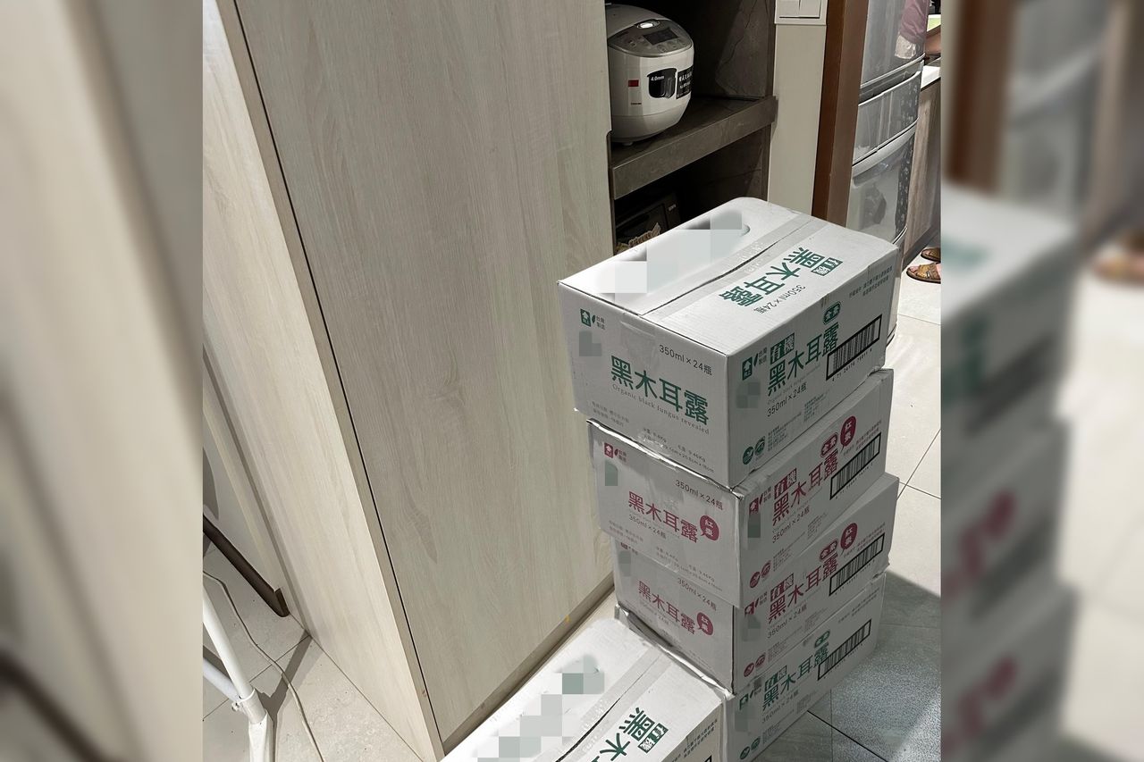 這位女網友在●【爆怨公社】●分享家中趣事,阿嬤只是在群組傳了「這家黑木耳露不錯喝」,沒想到家裡就出現五個大紙箱,她忍不住hashtag笑呼「#黑木耳露大富翁」,並透露飲料堆高高的原因「#爸爸買媽媽買哥哥買妹妹買我也買」,最後開玩笑說「#是不是要一個沒有阿嬤的群」。