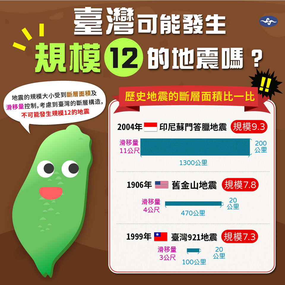 台灣位處板塊交界處,因此導致地震頻繁,不過中央氣象局表示,地震規模受到斷層面積、滑移量控制,以台灣的地質構造而言,不太可能發生規模8以上的地震,甚至不可能產生規模12的地震,否則200兆公尺的錯移量,已經超越整個地球。