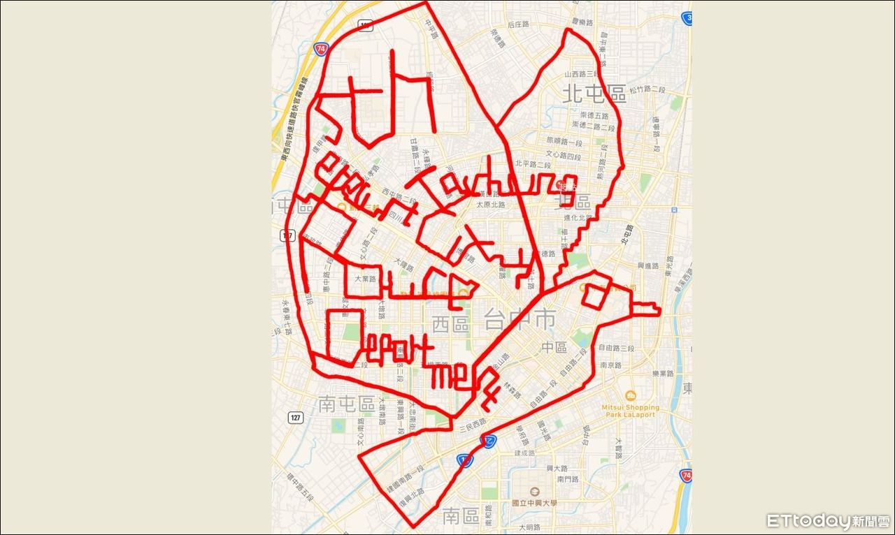 他在騎乘過程中也意外發現,總共經過永興所、立人所、何安所、交大二中隊、四平所、水湳所、西屯所、市政所、黎明所、大墩所、公益所、南屯所、正義所、繼中所、合作所、育才所等16個警察單位,創意的軌跡不但達到慶祝的目的,更巧合的融入友軍單位,令人讚嘆連連。
