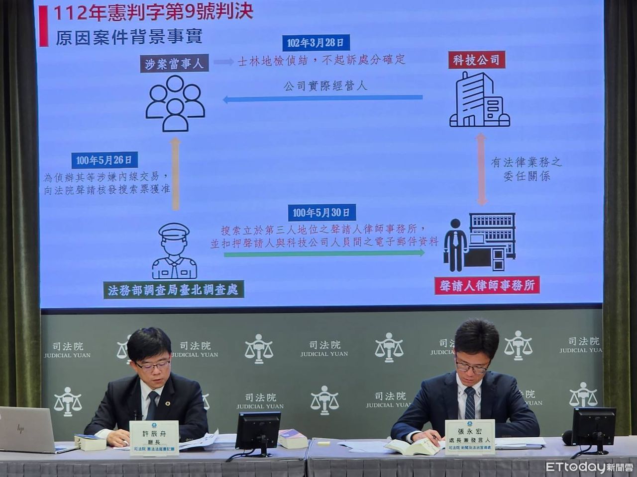 憲法法庭於16日做出112年憲判字第9號判決,認為對第三人搜索的規定,「未將律師或辯護人與被告、犯罪嫌疑人、潛在犯罪嫌疑人間基於憲法保障秘密自由溝通權之行使而生之文件資料(如文書、電磁紀錄等),排除於得搜索、扣押之外,於此範圍內,與憲法第15條保障律師之工作權及憲法第16條保障被告之訴訟權之意旨不符,相關機關應於本判決宣示之日起2年內,依本判決意旨修正刑事訴訟法,妥為規定。」