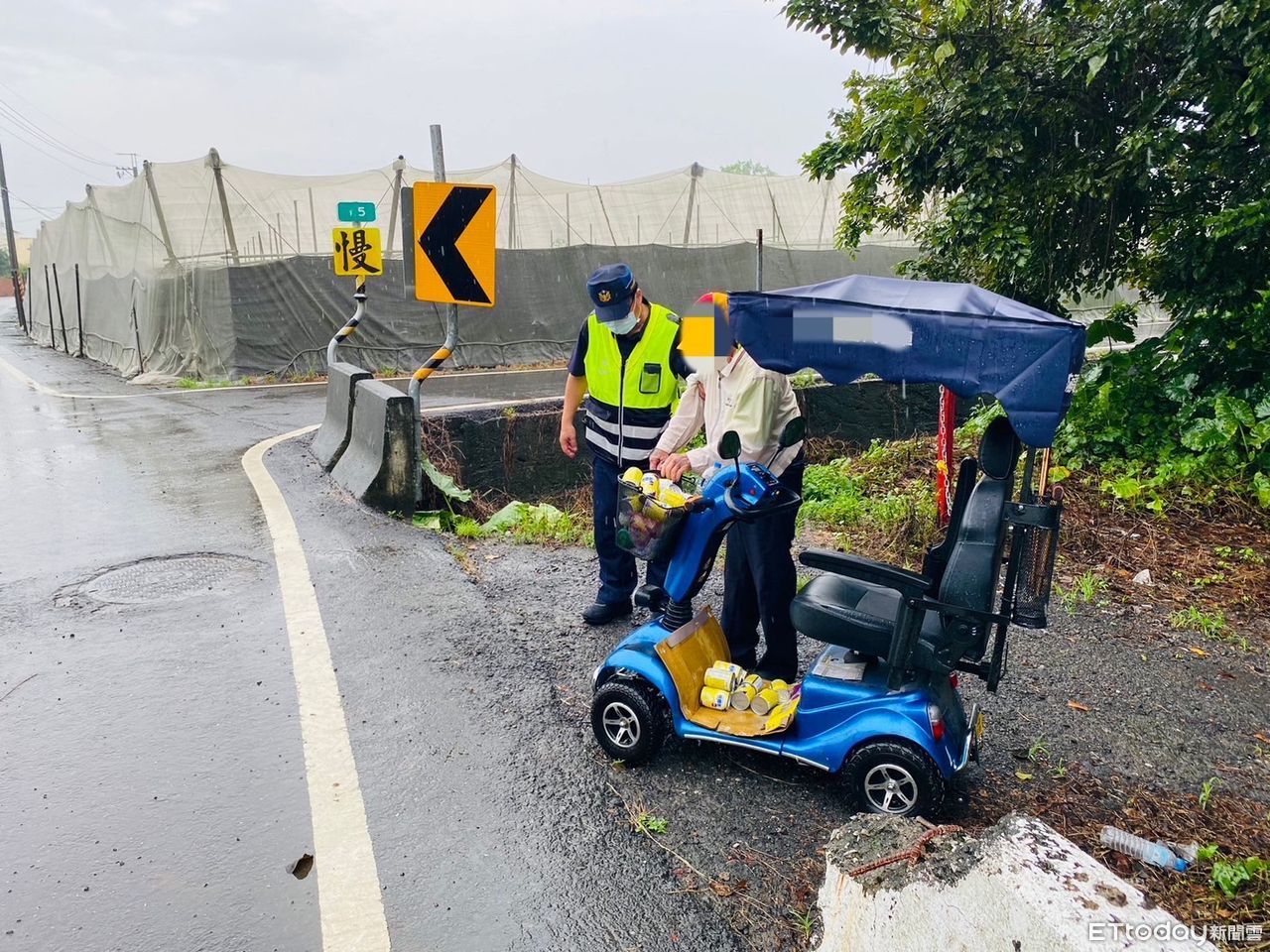 屏東崁頂鄉蔡姓阿北騎電動代步車外出購物,遇到下雨車又沒電,又未帶手機,窘在路旁不知所措,東港警分局員警巡邏看到,下車關心,得知原因,駕駛巡邏車送他返家,讓家屬很感激。