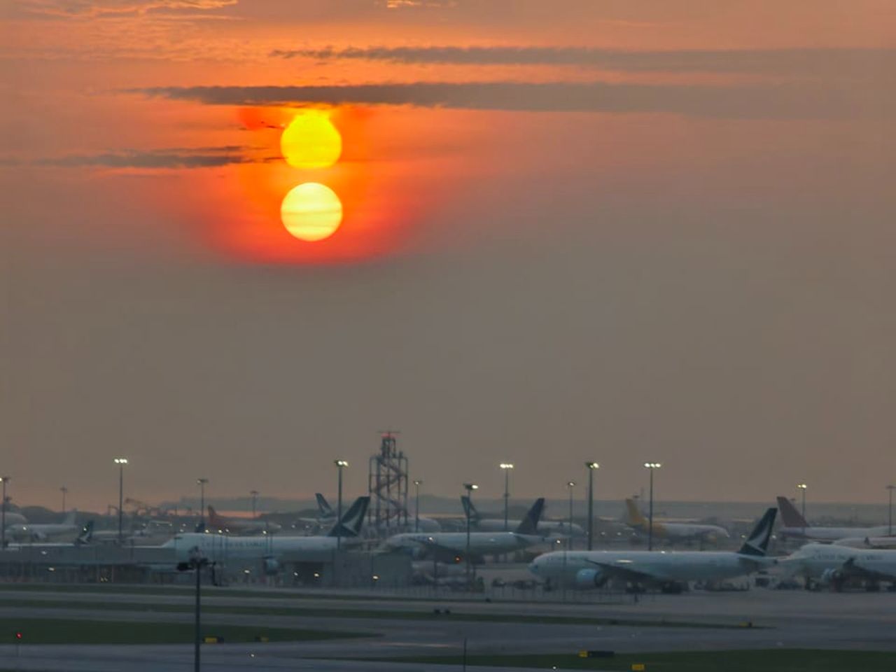 有網友在社交平台Facebook分享稱,昨(15)日傍晚時於赤蠟角機場,意外地拍攝到「雙太陽」的奇景,估計與水氣反射有關。從照片可見,灰濛濛的天空出現上下排列的兩個太陽。