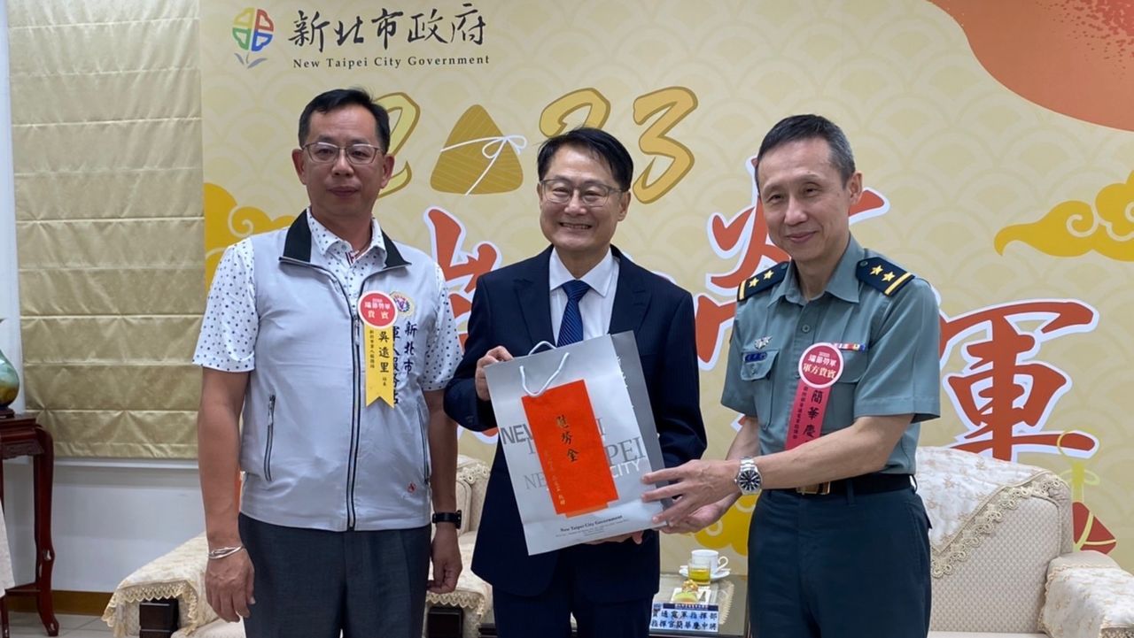 ▲資通電軍指揮部簡華慶中將(右1)感謝陳副市長陳純敬率團前來進行端節慰問活動,讓全體士官兵感受在地鄉親支持。(圖/新北市民政局提供,下同)