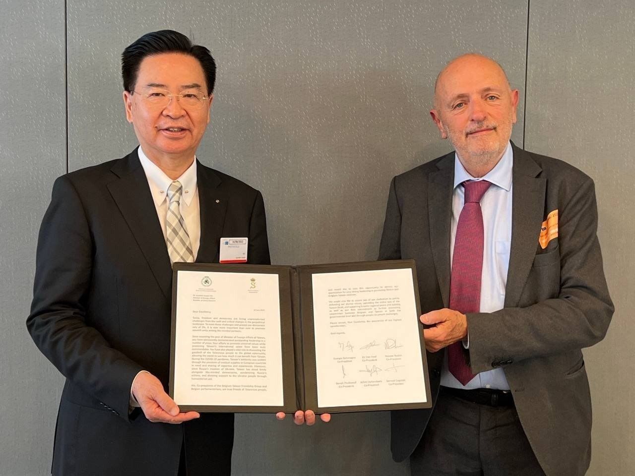外交部長吳釗燮近日訪問歐洲議會,與12位跨國議員會晤交流,歐洲議會友台小組及比利時國會友台小組,分別於會議中頒贈感謝狀及聯名謝函。外交部18日表示,此行訪問歐洲議會獲得議會高規格接待,凸顯歐洲議會對台灣的重視及對雙邊強化合作夥伴關係的積極作為。
