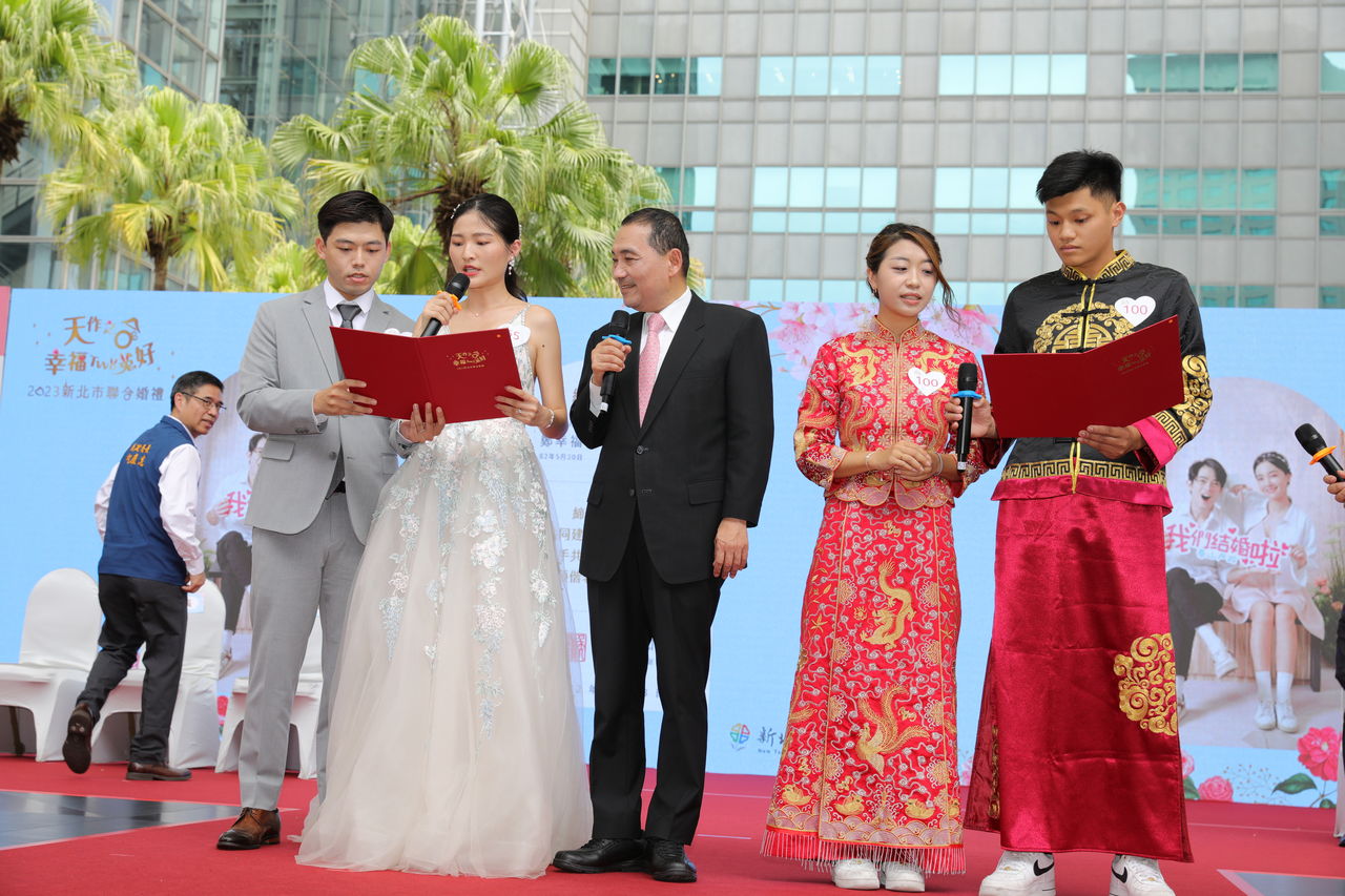 2023新北聯合婚禮「天作之合幸福TWO兔好」今(18日)在市民廣場浪漫登場,現場特別以府中雙城為意象,打造新舊交融浪漫氛圍,新人們穿著中式秀禾服、西式婚紗禮服進場,洋溢幸福,市長侯友宜、副市長劉和然擔任證婚人及主婚人,並抽出50項好禮,祝福新人幸福成家。