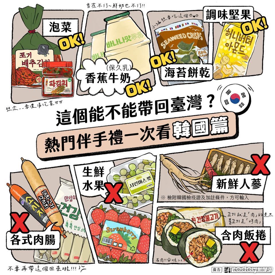 端午連假期間,不少民眾安排出國旅遊。農委會動植物防疫檢疫局指出,韓國是國人出遊的熱門國家,為避免自韓國返台入境的旅客,因為買了不得攜入境的伴手禮被開罰,特別製作「哪些能買」圖解清單,像是泡菜、香蕉牛奶、海苔、調味堅果等皆可,但肉腸、生鮮水果、人蔘、含肉飯捲就不行。