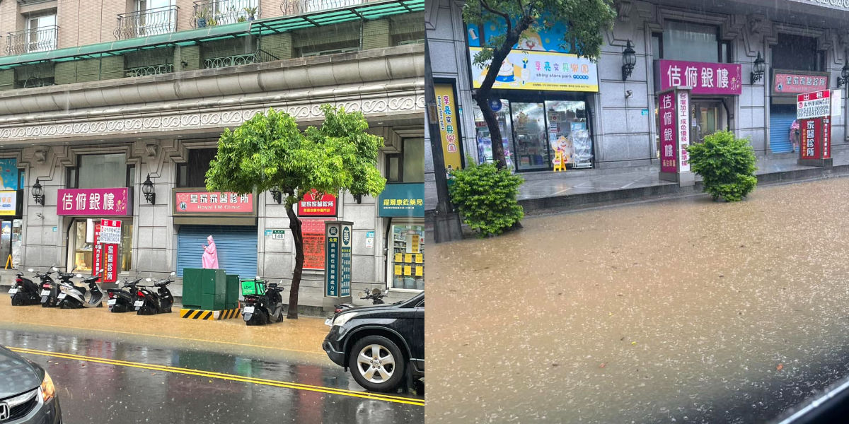 一名女網友在《我是中和人》貼出淹水畫面,表示莒光路上出現暴雨,其中停在路邊的機車輪胎1/3泡在黃泥濁水裡,呼籲車主趕快來移車。底下也有民眾PO出照片,可見路上淹一片大水,「雨水還沒退以前,請大家注意安全!」