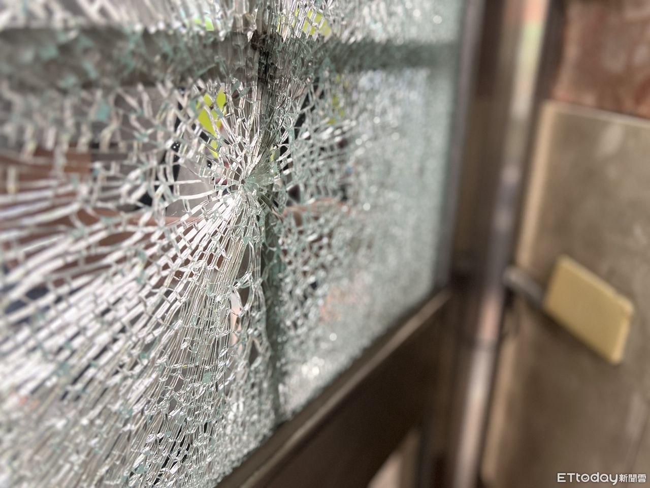 ▲▼板橋一處社區一樓玻璃破裂,留有彈孔。(圖/記者戴上容翻攝)