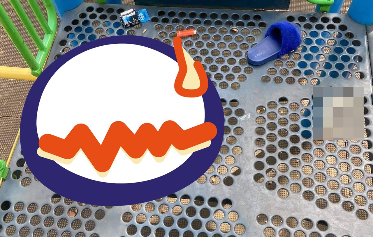 有網友在臉書「爆廢公社」發文,「以後不帶小孩去公園玩了」,還附了哭哭臉的表情符號。從照片中可以看到,公園的遊樂設施上,有一條桃紅色的蕾絲內褲,以及7個使用過的保險套,包裝及套套散落一地,還有一隻拖鞋,疑似是激烈的野外大戰後遺留下的。