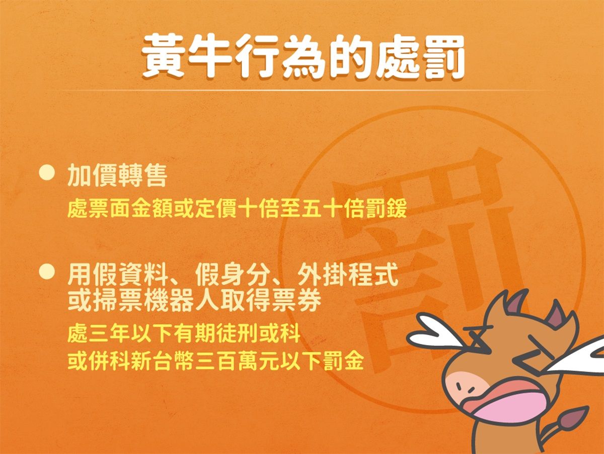 對於黃牛的懲罰,文化部強調,絕對不會輕放,除了持續接受檢舉,也將透過網路巡檢及地方政府查緝取締,不斷追蹤各種不法情況。文化部再次鄭重呼籲所有民眾,切勿以身試法,也請所有歌迷朋友「不要成為黃牛或詐騙的幫兇」,以正確的購票方式,才能真正展現支持喜愛的歌手。