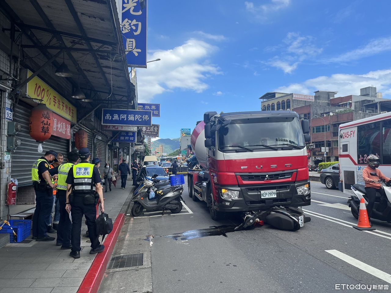 ▲27日下午北市南港路一段發生水泥預拌輾斃機車騎士車禍。(圖說下同/記者張君豪翻攝)