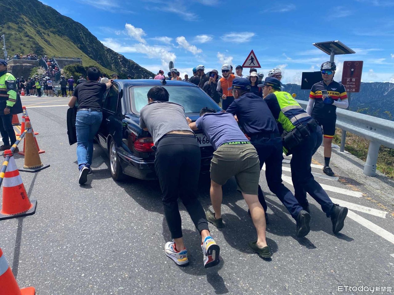 ▲▼仁愛警方合力將拋錨的賓士車推上武嶺,確保自行車賽事順利進行。(圖/記者高堂堯翻攝)