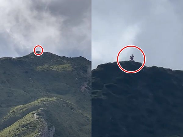 影片顯示,原PO先用正常倍率拍攝,發現山頂上有黑色小物體佇立;第二個影片將手機放到大5倍的倍率,發現山頂上有兩人在互動,「後來在與老婆討論時,沒有錄影了,但再看他們時,在稜線移動的速度很快,距離這麼遠,看起來怎麼可能有這種速度」。