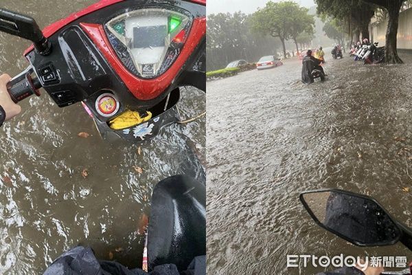 從照片中可見,水深超過半個輪胎高,他的整台機車幾乎沒入水中,只剩車頭及椅墊,而騎士們也被迫在水中牽著車,緩緩前行。