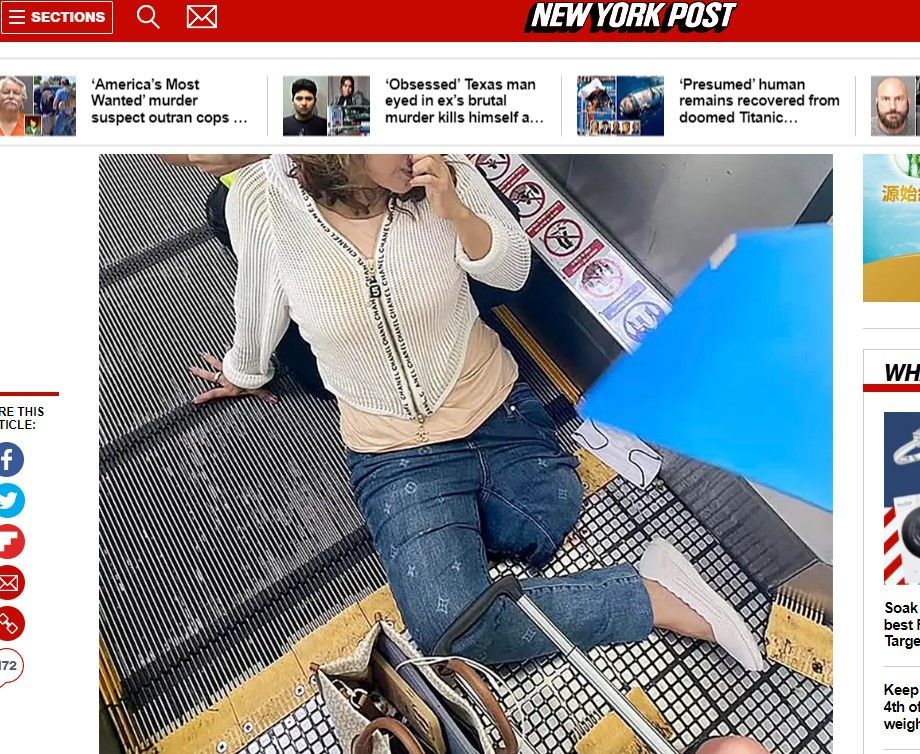 ▲廊曼機場一名女性旅客左腿被捲入電動步道。(圖/翻攝自紐約郵報網站)