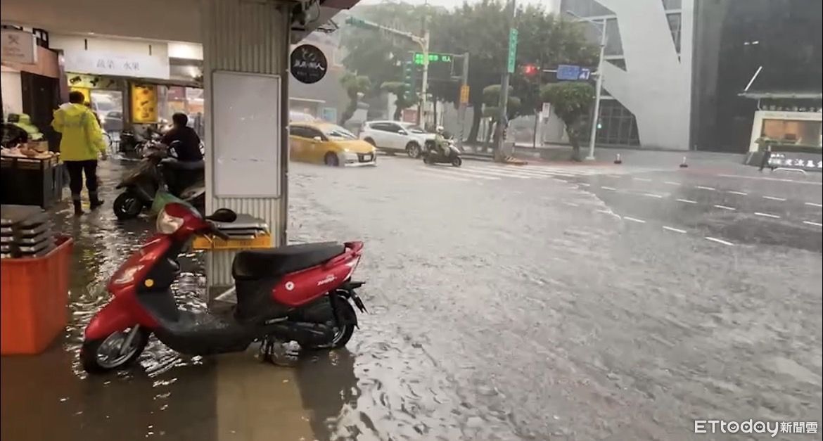 ▲北市中山區30日因大雨狂轟,北安路一度水淹達半個機車輪胎。(圖/記者邱中岳翻攝)