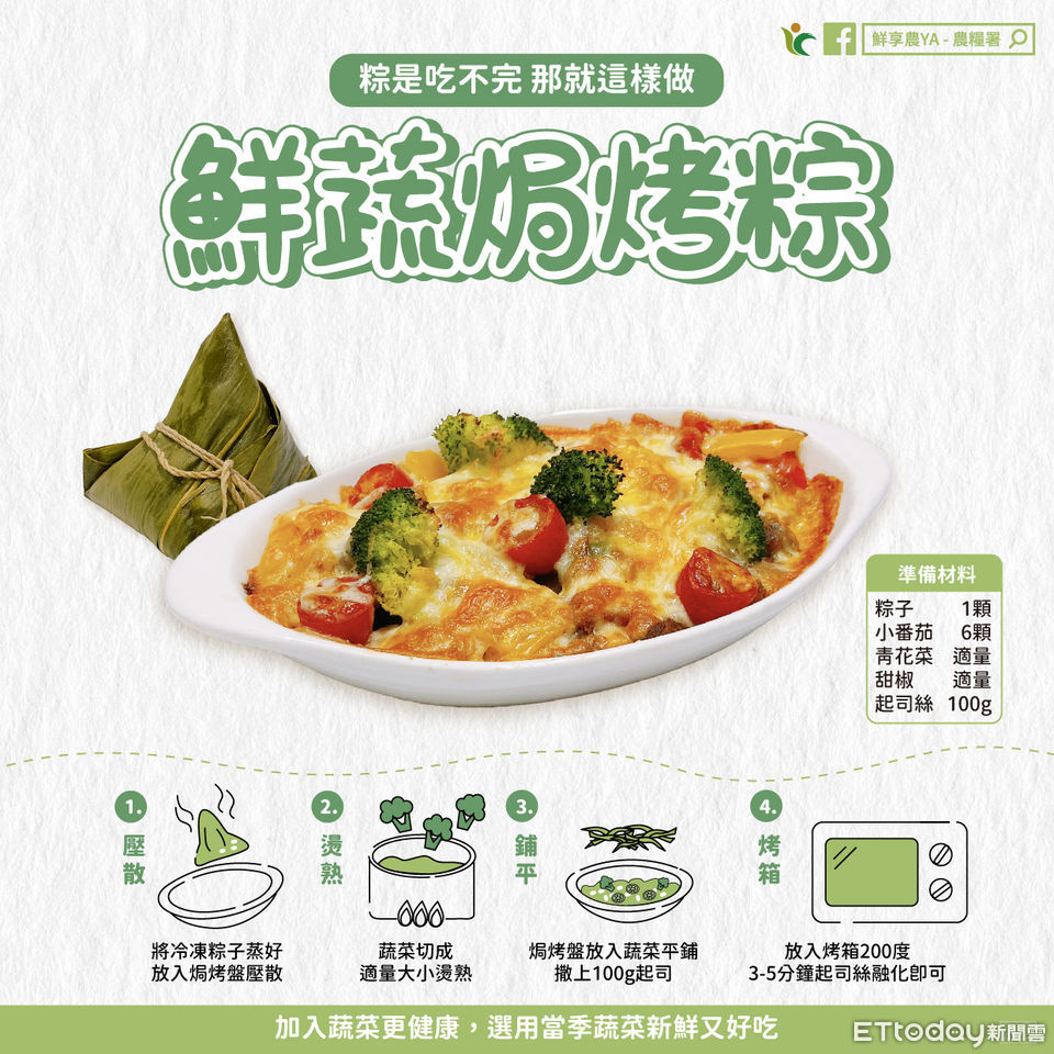 農糧署在臉書粉專「鮮享農YA」發文,建議網友可以把家中吃不完的粽子,添加當季蔬菜,再配上鹹香起司,中西合併料理手法,讓粽子變身義式焗烤料理,還可以孩子一起做料理、一起學習蔬菜知識,從認識農產、產地、生產方式,到如則挑選保存,是最適合假日的食農教育活動。