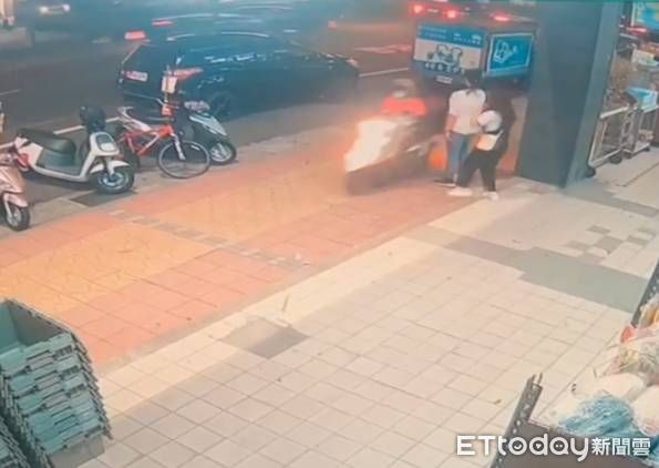 ▲男子從五金行走出來,被違規騎人行道的外送員撞上。(圖/記者蔡文淵翻攝)