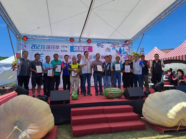 張市長指出,觀音區是得天獨厚、美麗的魚米之鄉,也是瓜果類主要產地,不僅是北台灣蓮花的代表,瓜果產品也極具特色,今日觀音區農會為推廣優質西瓜,並在蓮花季主會場舉辦西瓜評鑑比賽,現場也展示瓜果節得獎瓜果,包括第一名86.09台斤重的超級大西瓜,以及787.5台斤、獲得全國冠軍的大南瓜。