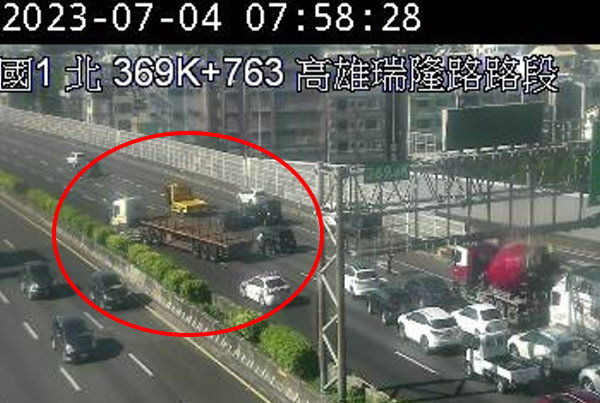 高公局表示,今天(4日)7時39分,國道1號南向369.8k、高雄瑞隆路路段,因發生拖板車跟4小客車追撞事故,主線暫時管制封閉。目前該路段時速「紫爆」,僅剩2公里。