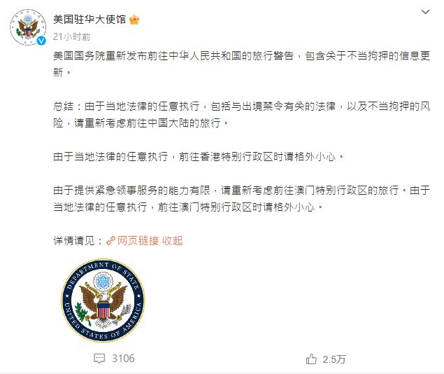 ▲美國國務院發布最新赴中國旅行警告。(圖/翻攝自微博)