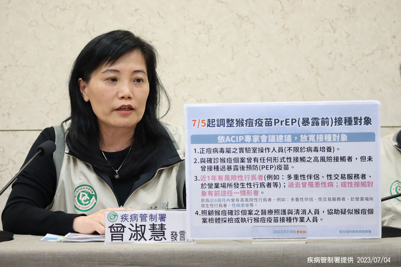 疾管署表示,依據6月28日召開之衛生福利部傳染病防治諮詢會預防接種組(ACIP)會議決議,擴大猴痘疫苗接種對象,將自7月5日起正式調整Mpox疫苗暴露前預防(PrEP)接種對象,由原先「近6個月內曾有高風險性行為者,例如:多重性伴侶、性交易服務者、於營業場所發生性行為者、性病患者等」,放寬為「近1年有風險性行為者(例如:多重性伴侶、性交易服務者、於營業場所發生性行為者等);過去曾罹患性病;或性接觸對象有前述任一情形者」。