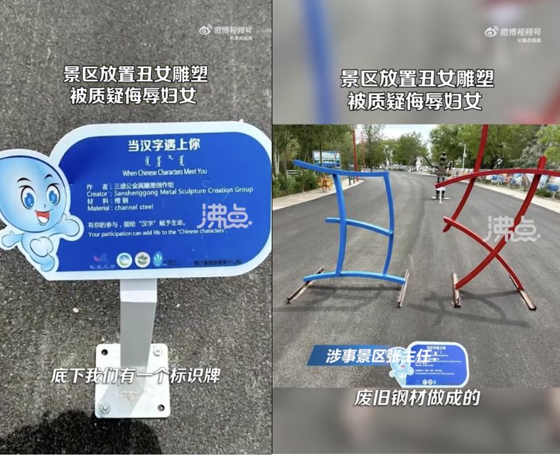 內蒙古巴彥淖爾市一景區日前設置「丑(同繁體字醜,下同)、女」字樣的雕塑,網友表示,不能理解雕塑是否有侮辱女性的意味。對於外界的批評,景區回應,金屬雕塑只是一個互動項目,並沒有侮辱女性惡意。