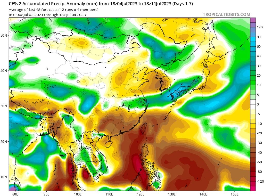 台灣颱風論壇說,日本及中國華東則是藍綠色,表示「相對多雨」,這是梅雨鋒面造成,未來一周如果有要去日本玩的朋友,請多注意天氣預報;太平洋高氣壓太強勢了,颱風至少要等月底才有機會出現。