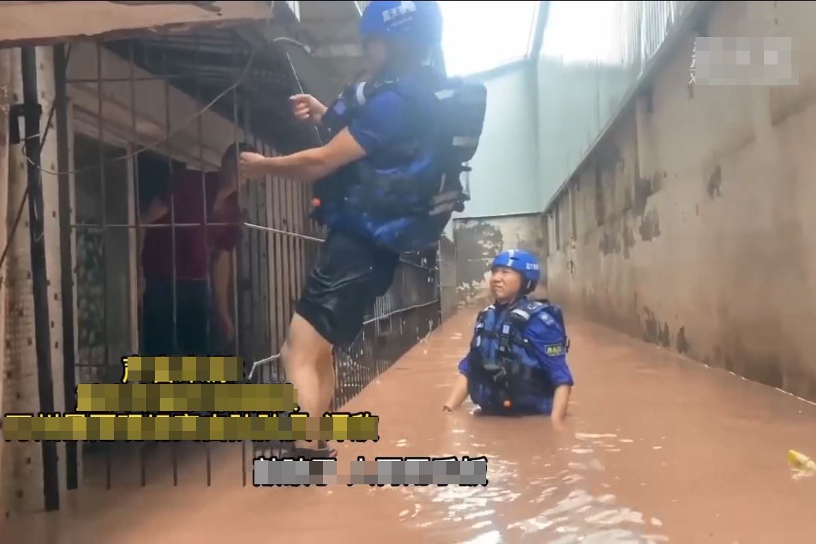 ▲洪水淹沒大門,老人只能站在陽台求救。(圖/翻攝自微博/新華社)