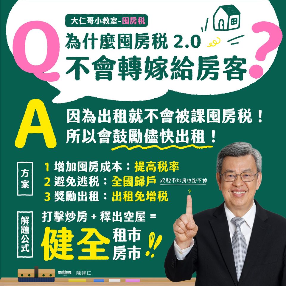 ▲陳建仁解答囤房稅不會轉嫁給房客。(圖/翻攝自Facebook/陳建仁)