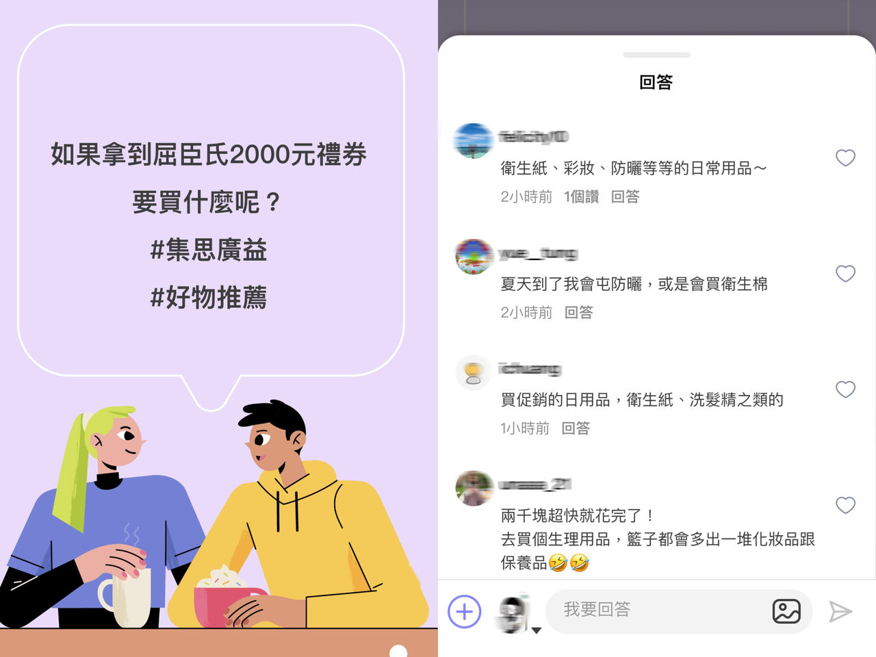 MOOD APP熱門話題「2000元會在屈臣氏買什麼」,底下的回答可以分出兩派,女性用戶大多會買彩妝保養、防曬、生理用品為主,尤其以衛生棉的回答最多;而男性則普遍會選洗衣精、衛生紙等生活消耗品,男女兩派在購物上的取向有明顯的區別,此外還有部分男性用戶表示不知道要買什麼,也延伸出抱怨女友的留言,「明明東西都差不多,每次進去都要逛超久」、「一到屈臣氏我就變望夫石」,對此也有網友總結出「藥妝店就是女生的天堂」。