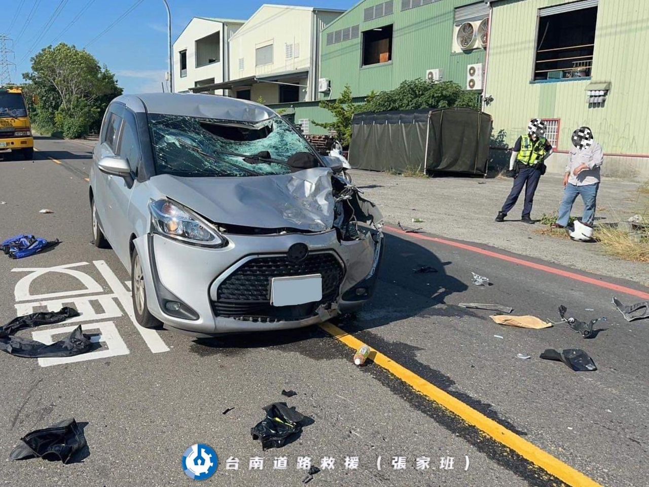 據了解,兩車車頭部分嚴重毀損,自小客車前車窗破碎凹陷,疑邱男撞擊時連人撞飛撞上自小客車前車窗才落地,機車車頭幾乎全毀,可見當時撞擊力之大,永康分局據報已派員在現場完成勘查測繪蒐證,目前肇事原因及相關責任由警方調查處理中。