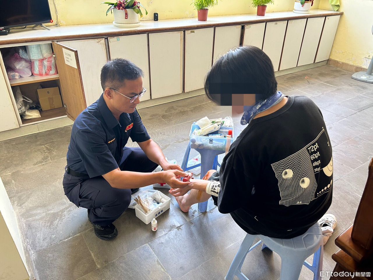 ▲受傷的邱同學到派出所請求協助,員警幫忙上藥 。(圖/記者吳奕靖翻攝)