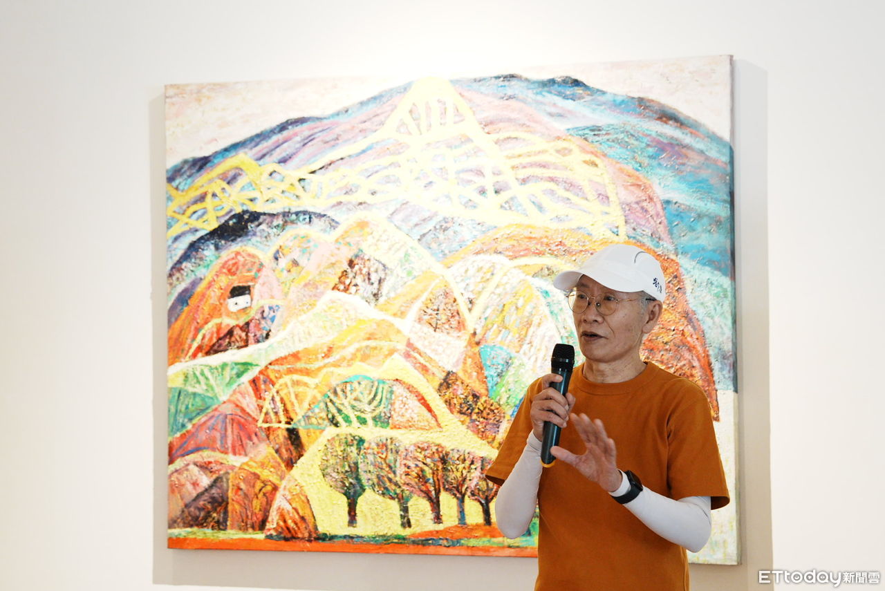▲畫家鄭福成8日於台南甘樂阿舍美術館,舉辦2023個展「山外山」開幕茶會,歡迎來欣賞畫作之美。(圖/記者林悅翻攝,下同)