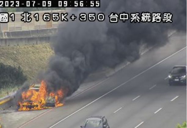 國道1號南下165公里處台中系統路段今(9)日上午9時51分驚傳火燒車,1輛轎車不明原因停靠在路肩,突然起火燃燒,大量濃煙直竄天際,消防人員獲報前往撲救中,詳細肇因還有待釐清,請用路人小心駕駛。