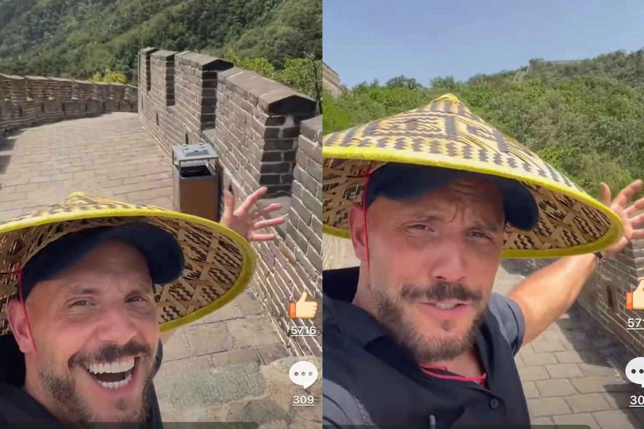 陸媒釋出影片顯示,大衛班6日前往北京長城景區,頭戴斗笠防曬,裝扮相當接地氣,興奮的鏡頭展示「包場」長城好風景,大呼「我在長城上!」接著滿意的大笑,送出飛吻給網友們,相當逗趣。