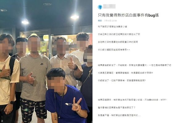 還有另篇以「只有我覺得熱炒店白飯事件有bug嗎」為標題的貼文,男網友認為,先不說27個學生消費多少錢,去熱炒店就是要吃白飯配重口味的菜,特別是五更腸旺、蒼蠅頭這種重口味的菜,點炒飯、炒麵配菜哪有意思?結果飯沒了,只能點菜,學生食量再大,也只能結帳離場。