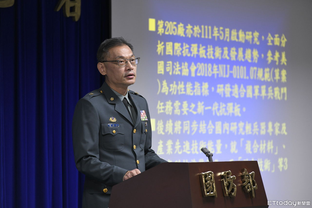 國防部11日舉行例行記者會,說明國軍三級抗彈板測試。軍備局205廠廠長潘煥亞少將表示,單兵防護裝備所用的抗彈板必須考量風險因子、重量、機動力及戰鬥動作等各項綜合因素,目前世界主要國家部隊的個人防護裝具仍以三級抗彈板為主流。