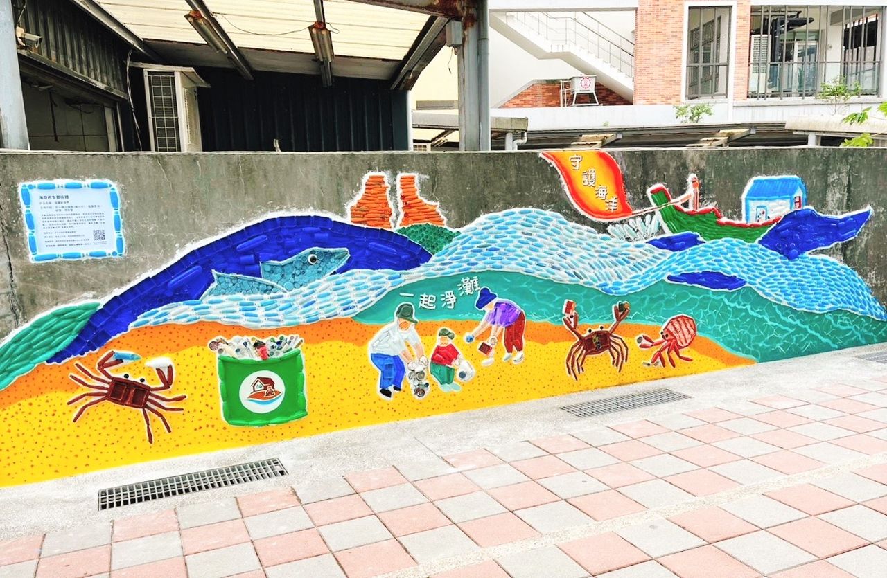 環保局表示,6月份分享金山區海岸私房景點「海廢再生藝術牆」,地點位在金山立體停車場往金山老街的通道上,是環保局特別與海湧工作室合作,用瓶蓋、塑膠瓶、浮標等海廢創作,打造出金山磺火捕魚(蹦火仔)、燭台雙嶼、螃蟹、寄居蟹及淨灘元素的「海灘新境界」再生藝術牆,到金山旅行時,不妨順道探訪這個具有環教意義又獨一無二的美麗景點。