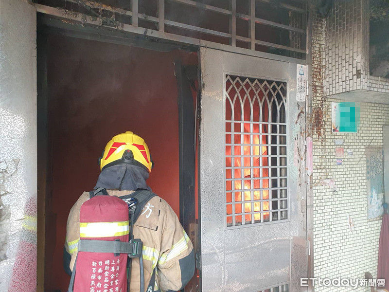 ▲台南市學甲區民權路1家民宅,12日上午11時12分許據報發生火警,現場冒出明火濃煙,消防人員射水搶救。(圖/記者林悅翻攝,下同)