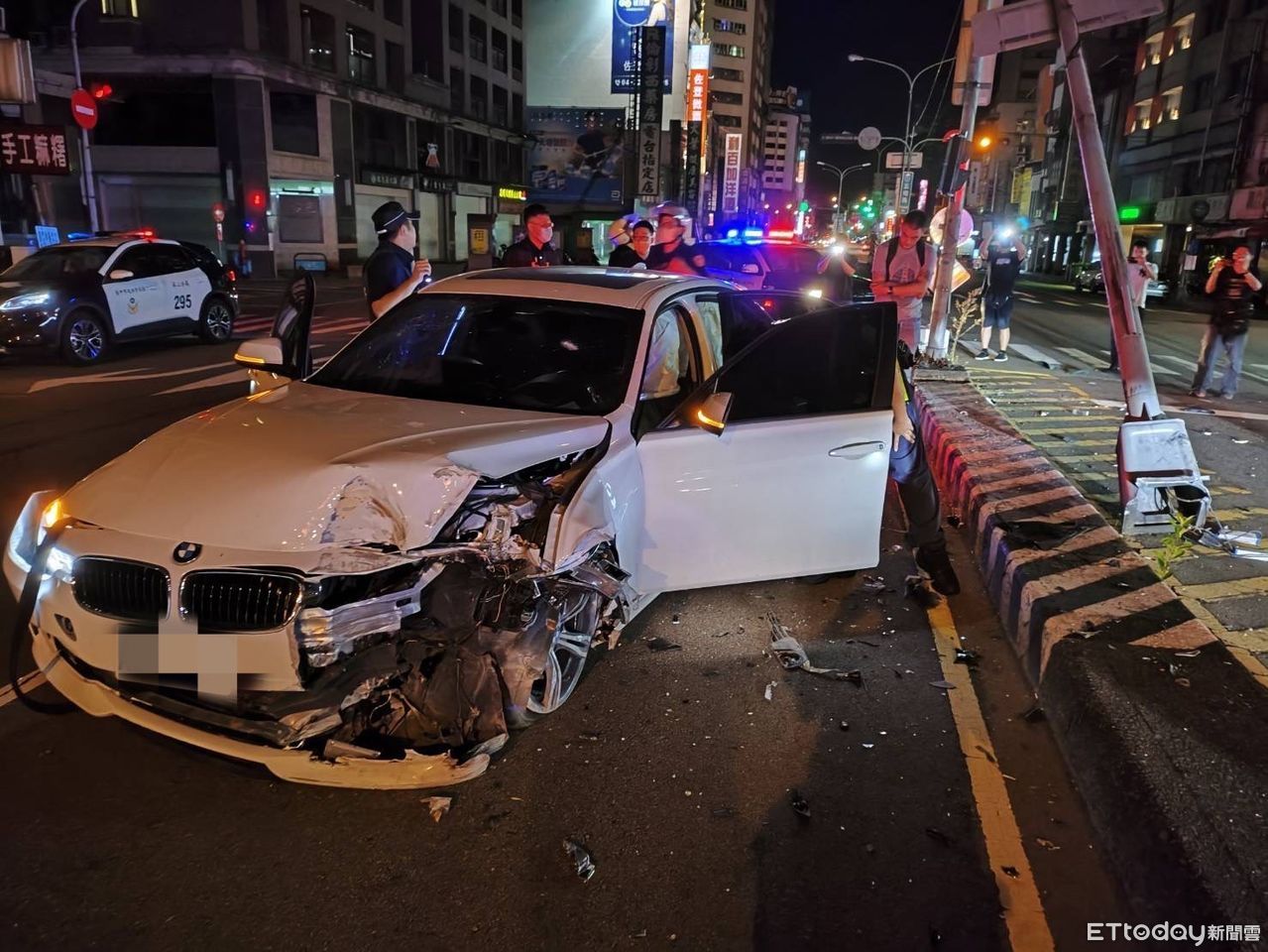 路口監視器拍下,林男從篤行路駛出後,右轉時失控,重重撞上分隔島,路口燈桿遭毀、斷裂,一瞬間路口「停電」整片漆黑,所幸未造成人員受傷。林男要價約200多萬的BMW轎車則是左前車頭損毀。