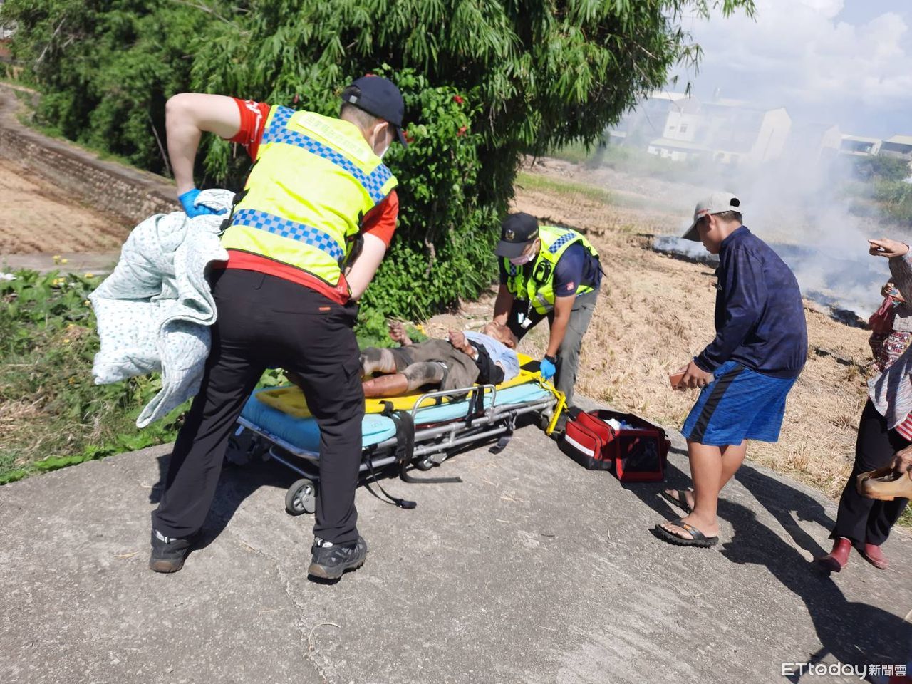 苗栗縣通霄鎮通南里一名約85歲的農民,今(12)日在墓園旁燒稻草,被嗆暈倒田中間,警消獲報後緊急到場搶救,農民雙腿及雙手約有15%二度燒燙傷意識昏迷,救護人員經治療後立即送醫。