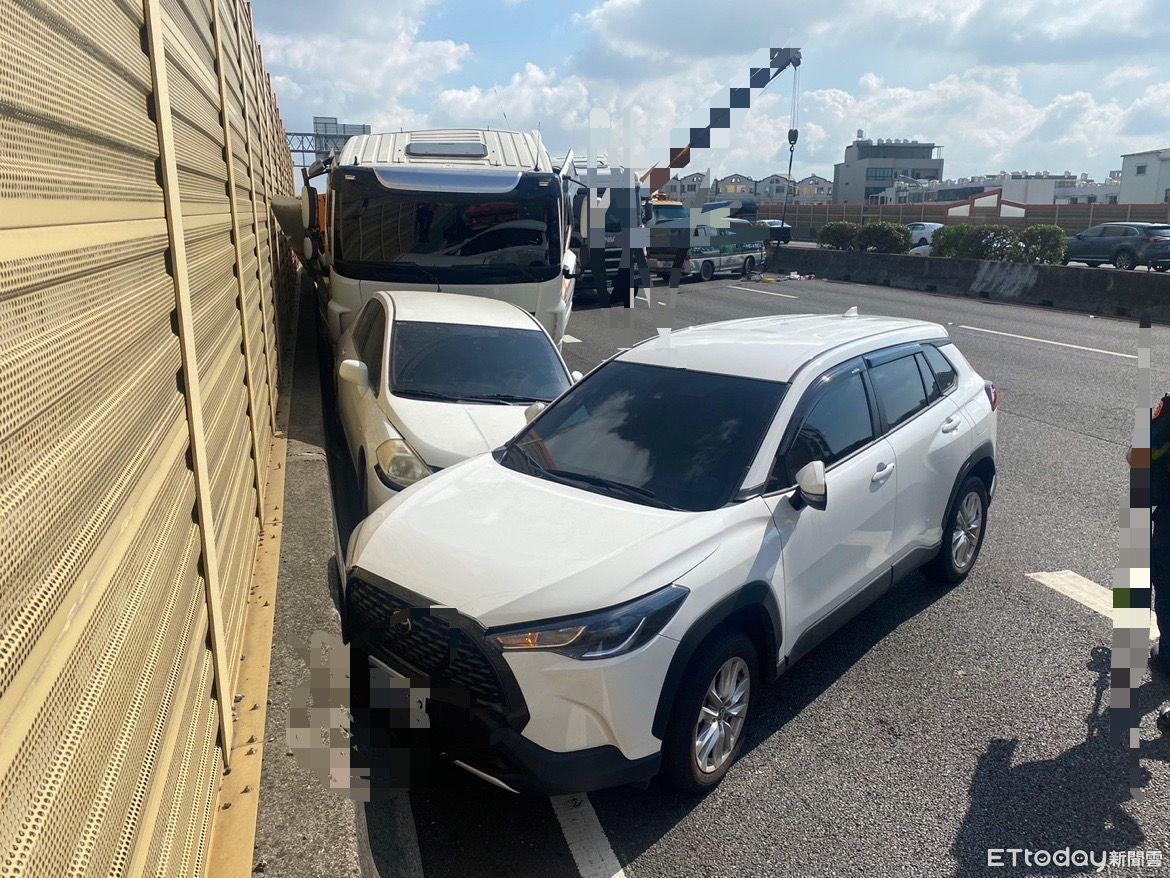 ▲國道1號南向322.6公里台南大灣路段,13日上午7時53分許,連續發生聯結車追撞2部小客車及1部小貨車急煞失控自撞翻車,共造成2人受傷送醫。(圖/記者林悅翻攝,下同)