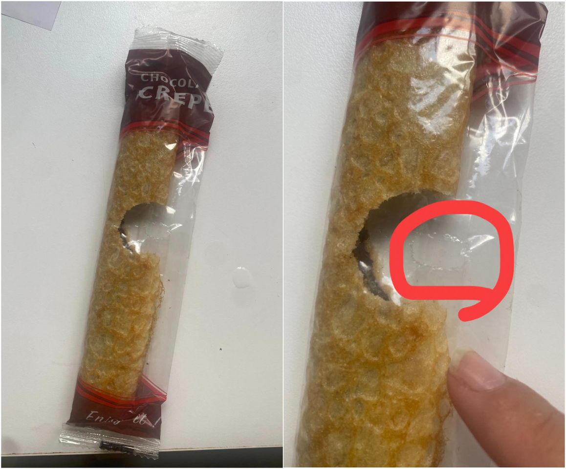 她接過來觀察,發現上下封口都沒有被拆開,只有外包裝中間多了一個小洞,薄餅也在該位置被咬出一個圓弧形,「要說老鼠咬的好像太整齊了吧,人的話這也不符合人的嘴巴,可是上下都沒開口,光靠那個洞用手抓起來吃也很奇怪」,讓她百思不得其解,不知道究竟是誰偷吃了。