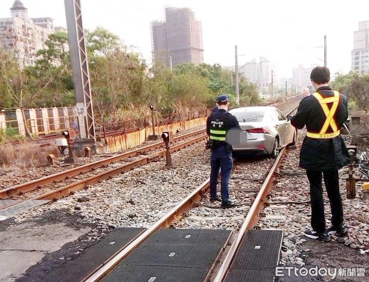 ▲桃園市1輛凌志轎車今年四月間誤闖永豐交流道且卡在鐵路上,台鐵人員與警方緊急到場處理。(資料照/記者沈繼昌翻攝)
