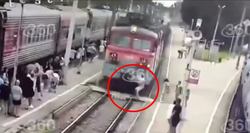 俄羅斯一名男子本周抱著2歲大的孩子來到火車站,企圖穿越鐵軌到對面月台。然而他沒注意到列車早已駛近,依據車站月台的監視器畫面,兩人被列車當場撞飛,摔在月台地上。