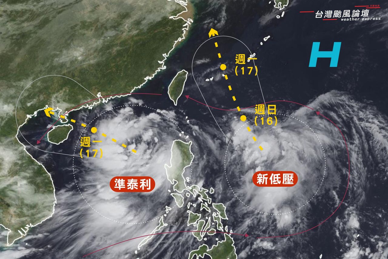 「台灣颱風論壇|天氣特急」提醒,下周三(19日)之前台灣均位於低壓帶中,天氣相當不穩定,下周四(20日)過後高壓重新增強,天氣逐漸穩定,恢復夏季型天氣型態;但菲律賓附近的熱帶系統持續活躍,未來10天除泰利之外,預估還會有1個颱風形成。