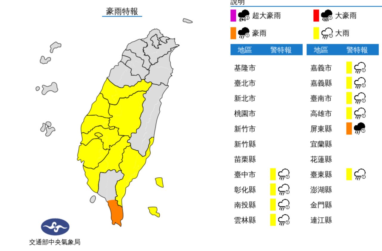 大雨:台中市、彰化縣、南投縣、雲林縣、嘉義市、嘉義縣、台南市、高雄市、台東縣、蘭嶼綠島