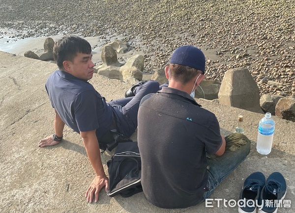 ▲陳姓男子與家人爭吵後獨自在堤防上喝悶酒,員警席地而坐安撫他。(圖/楊梅警分局提供)