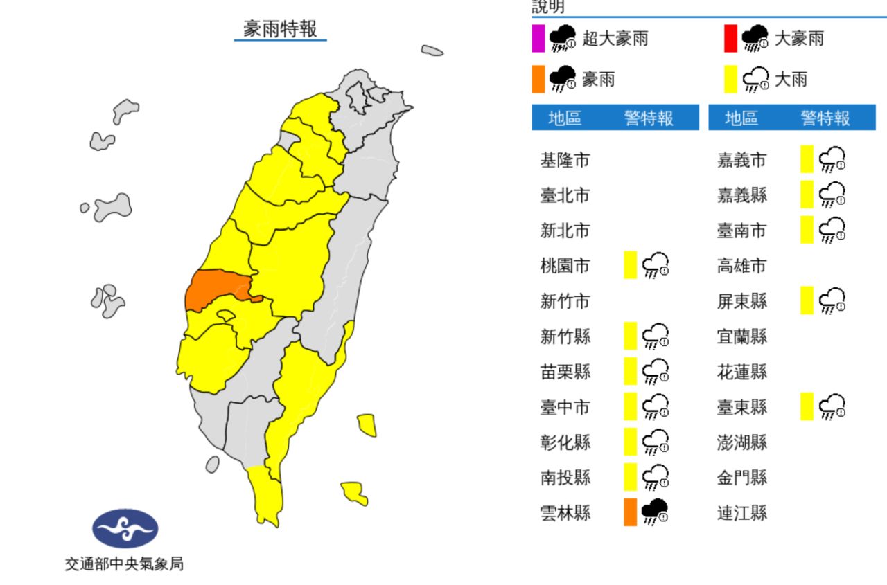 大雨:桃園市、新竹縣、苗栗縣、台中市、彰化縣、南投縣、嘉義市、嘉義縣、台南市、恆春半島、台東縣、蘭嶼綠島